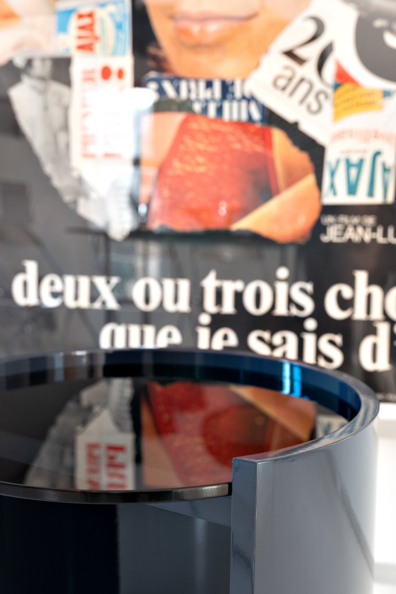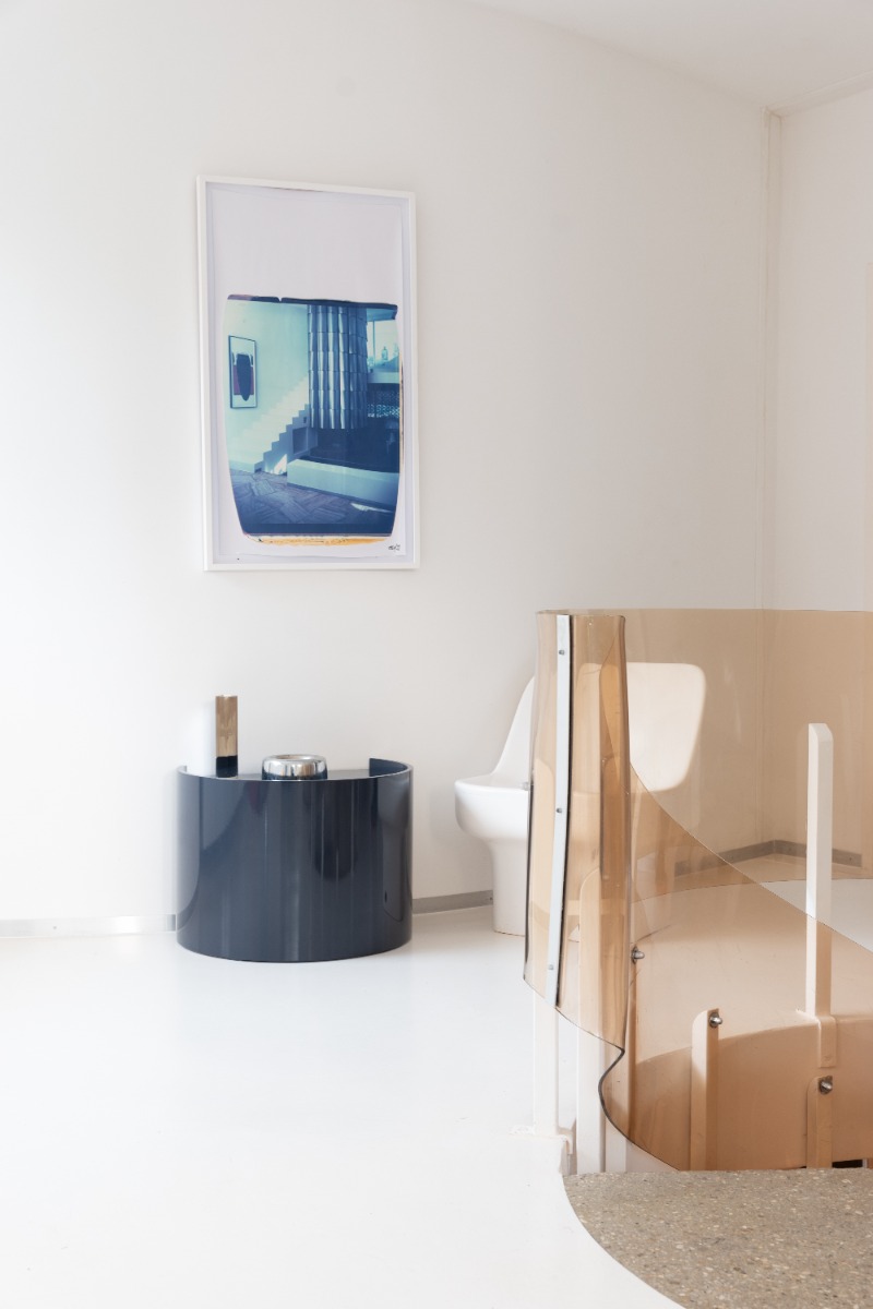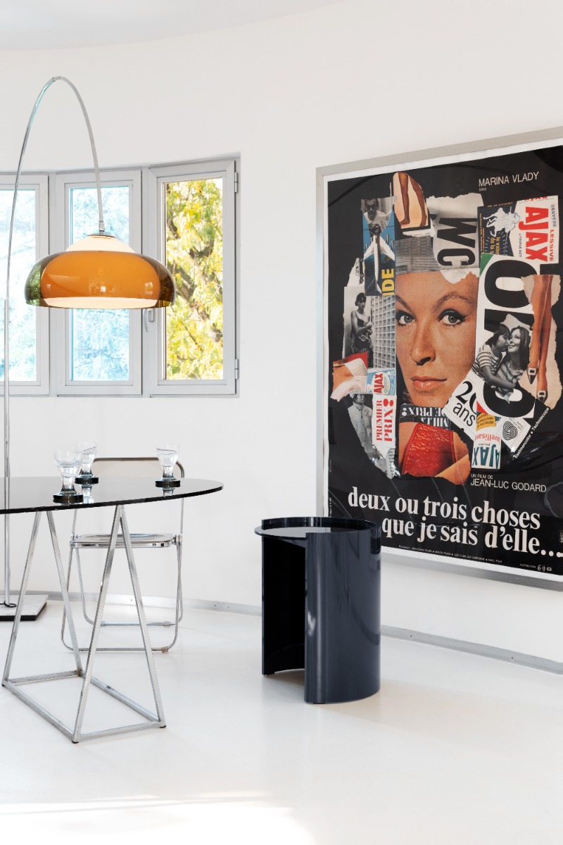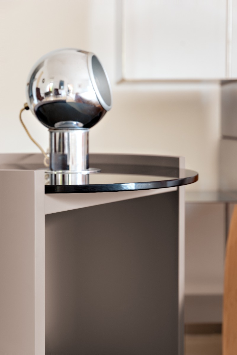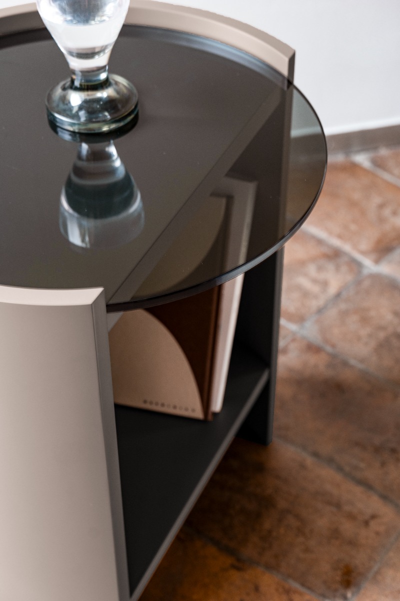 Der Beistelltisch kann optional erweitert werden – mit einer kreisrunden Glasplatte in der Farbe Rauchglas und einem extra Fachboden für mehr Ablage- oder Stellfläche. Ohne die Glasplatte, die lediglich aufgelegt wird, kann man ihn sogar mit der Öffnung an die Wand stellen und den Stauraum verbergen.