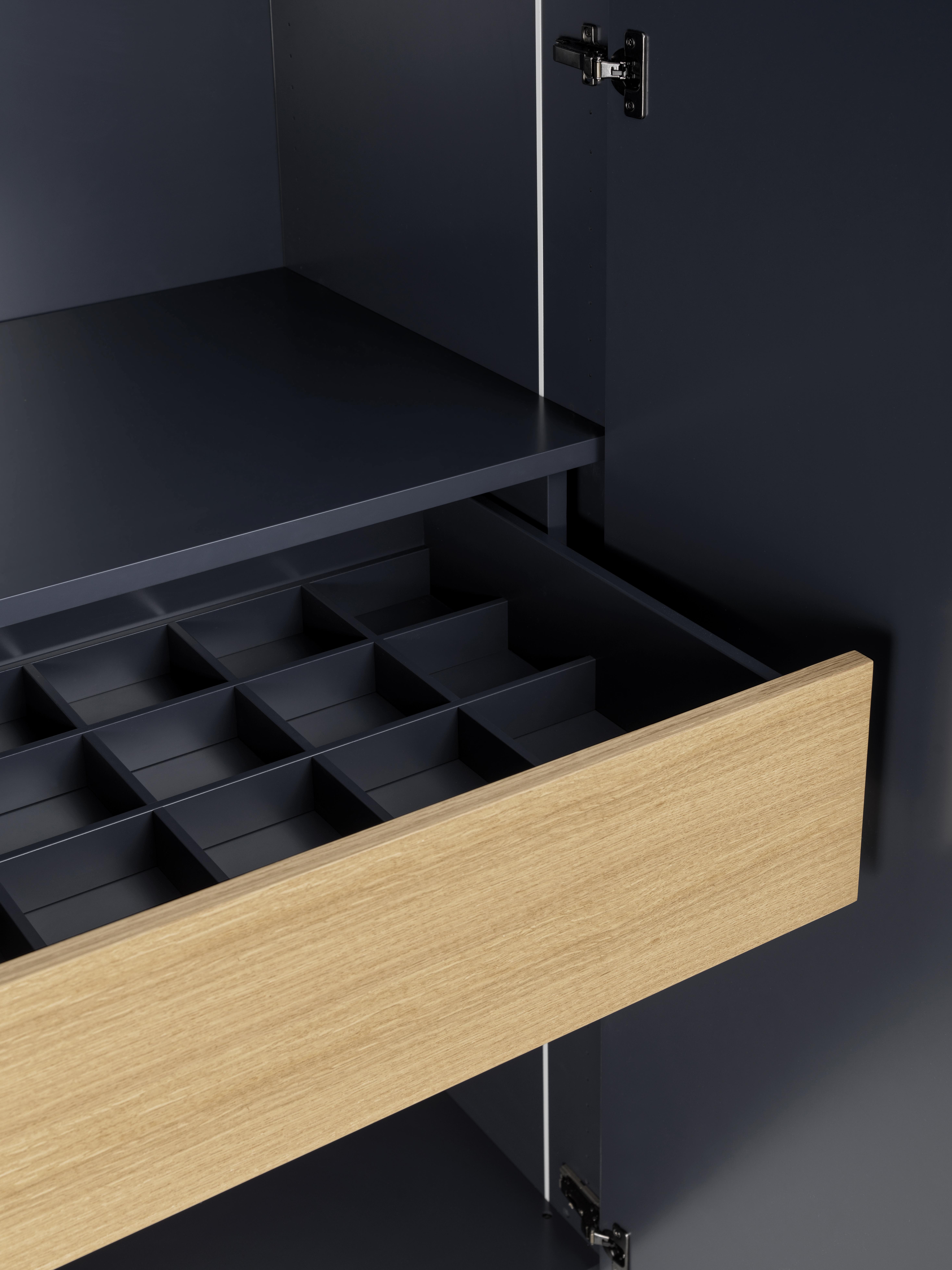 When ideas take shape: The CABIN SCREEN storage system is made to customer specification and offers personalised solutions for private as well as public spaces, from offices, studios and practices, to hallways, bedrooms and dressing rooms at home, in holiday apartments or in boutique hotels. The system also comprises freely configurable and combinable cupboard elements. These can measure between 60 and 300 cm in height, 30 and 130 centimetres in width and 35 and 70 cm in depth, and come with a single or a pair of doors. The interior can be configured as needed with loose shelves, drawers, shoe shelves, pull-out shelves and clothes rails. The door fronts come in two variants: with an oak veneer or fully lacquered finish in a choice of matt or high-gloss Schönbuch shades, or with glass doors featuring aluminium surrounds with a brown-anodised or matt-painted finish. The glass can be clear or smoked to add visual interest. A special feature of the CABIN SCREEN storage system is the hinges, which are elegant, clean and sunk virtually invisibly into the fronts of the sides. A stylish solution that befits the minimalist overall look of the system.